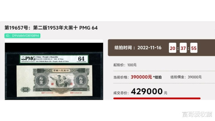 在2022年11月份的“春秋大拍”中,一张1953年的“大黑拾”,PMG评级分数(64分),临了拍出了429000元。