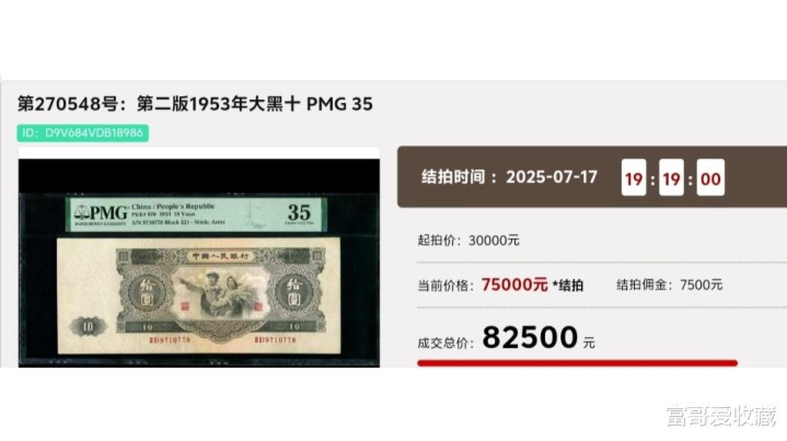 关于无为东说念主来说,要是有一张“通顺品”也挺可以的。在本年7月份的“春秋大拍”中,就有一张PMG评级35分的“大黑拾”,临了只拍出了82500元。