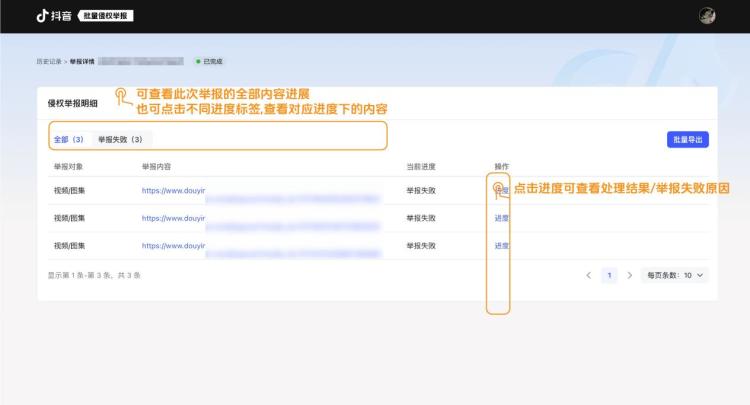 此外,面对成百上千条侵权举报本色,过往用户举报后需手动查对进程的问题也被责罚,实时跟踪处置贯通是这次升级的最大亮点。抖音批量侵权举报支持“历史纪录” 查询,用户不仅可显然检察PC端的举报纪录,举报列表还会小心呈现侵权类型、举报面目、提交时分及刻下处置进程等关键信息,可幸免叠加举报或遗漏。
